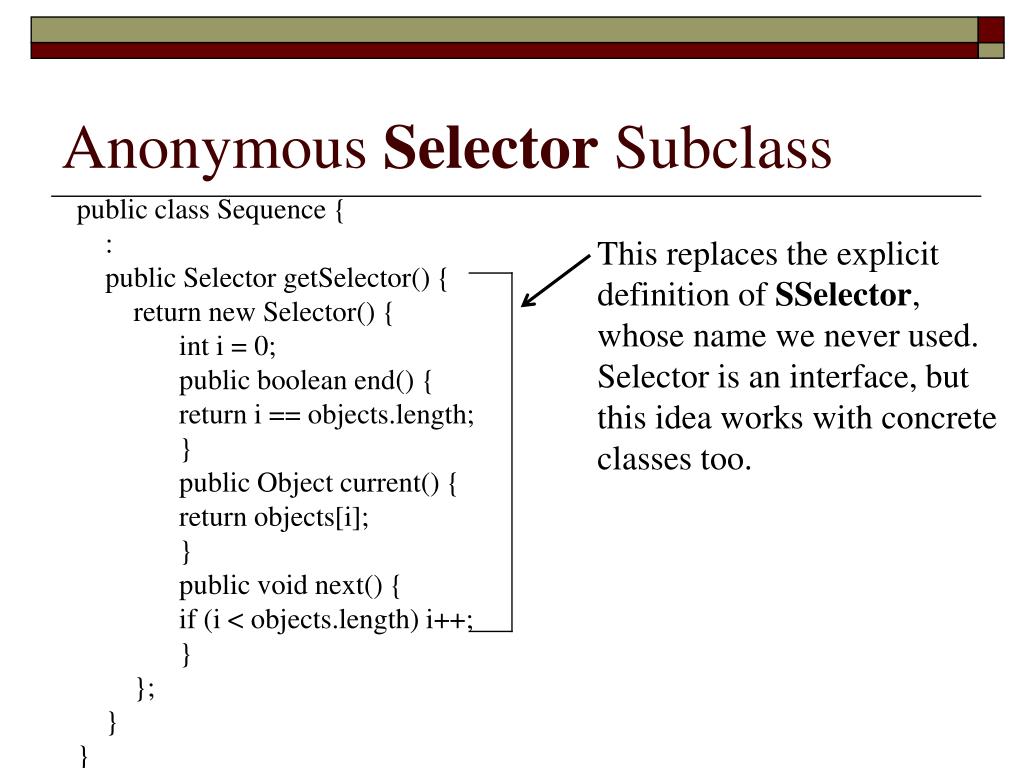 Anonymous Selector Subclass public class Sequence { : public Selector getSelector() { return new Selector() { int i = 0; public boolean end() { return i == objects.length; } public Object current() { return objects[i]; } public void next() { if (i < objects.length) i++; } }; } } This replaces the explicit definition of SSelector, whose name we never used. Selector is an interface, but this idea works with concrete classes too.