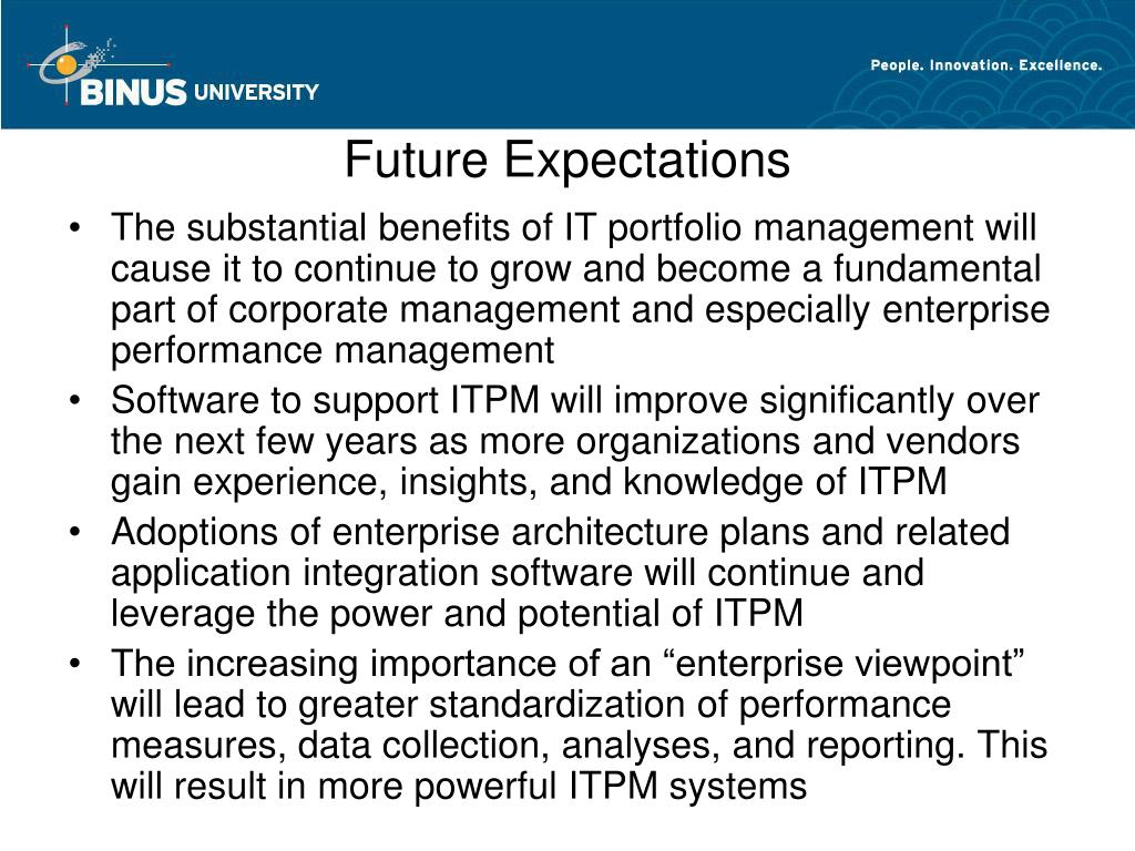 Future Expectations • There will be ongoing growth in the development of guidelines and best practices for portfolio development. They will aid such tasks as defining content categories , determining, data structures and relationships, and establishing criteria for portfolio balance and resource allocations • Automated approaches to capturing performance information will increase the quality and quantity of information provided to the IT portfolio. This in turn will increase the value of IT portfolio information provided to managers in support of their decision making • Vendors will increasingly offer software packages that integrate It portfolio management with other software to facilitate enterprise performance management.