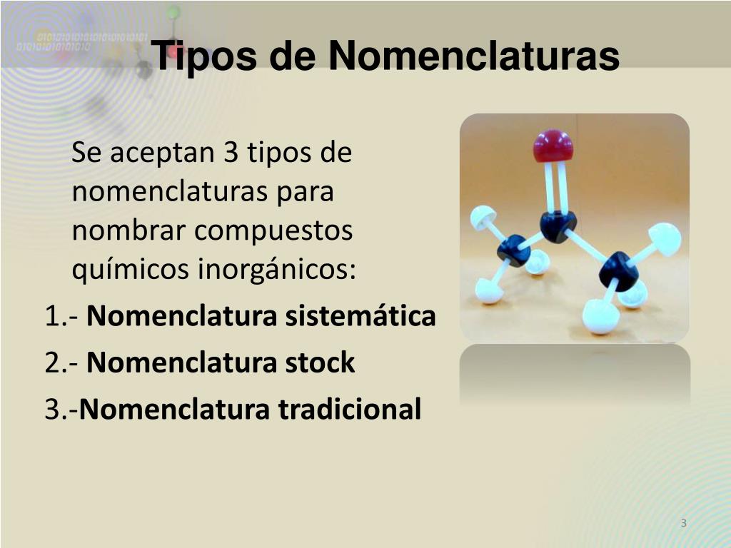 Tipos de Nomenclaturas Se aceptan 3 tipos de nomenclaturas para nombrar compuestos químicos inorgánicos: 1.- Nomenclatura sistemática 2.- Nomenclatura stock 3.-Nomenclatura tradicional