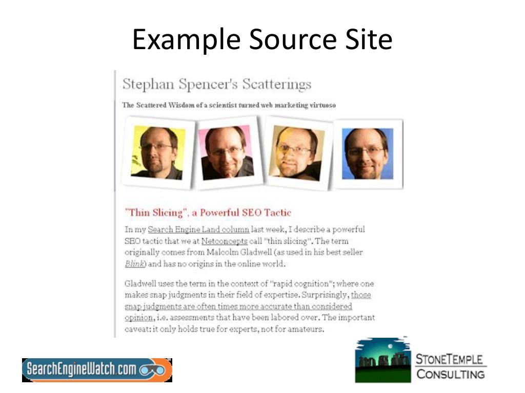 Content Syndication Example • Syndicated tens of thousands of pages • Exact copies of content for a major media site • To a PageRank 9 site • Sounds like major trouble, no? • SOLUTION: • NoIndex the syndicated pages • Prevents dupe content problem • Still passes link juice