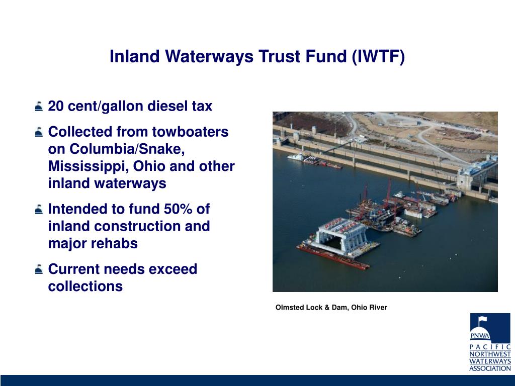 Inland Waterways Trust Fund (IWTF) 20 cent/gallon diesel tax Collected from towboaters on Columbia/Snake, Mississippi, Ohio and other inland waterways Intended to fund 50% of inland construction and major rehabs Current needs exceed collections Olmsted Lock & Dam, Ohio River