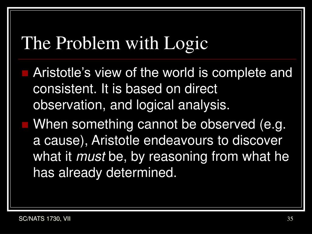The Problem with Logic • Aristotle’s view of the world is complete and consistent. It is based on direct observation, and logical analysis. • When something cannot be observed (e.g. a cause), Aristotle endeavours to discover what it must be, by reasoning from what he has already determined.