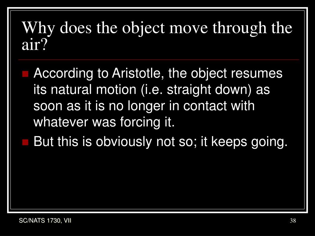 Why does the object move through the air? • According to Aristotle, the object resumes its natural motion (i.e. straight down) as soon as it is no longer in contact with whatever was forcing it. • But this is obviously not so; it keeps going.