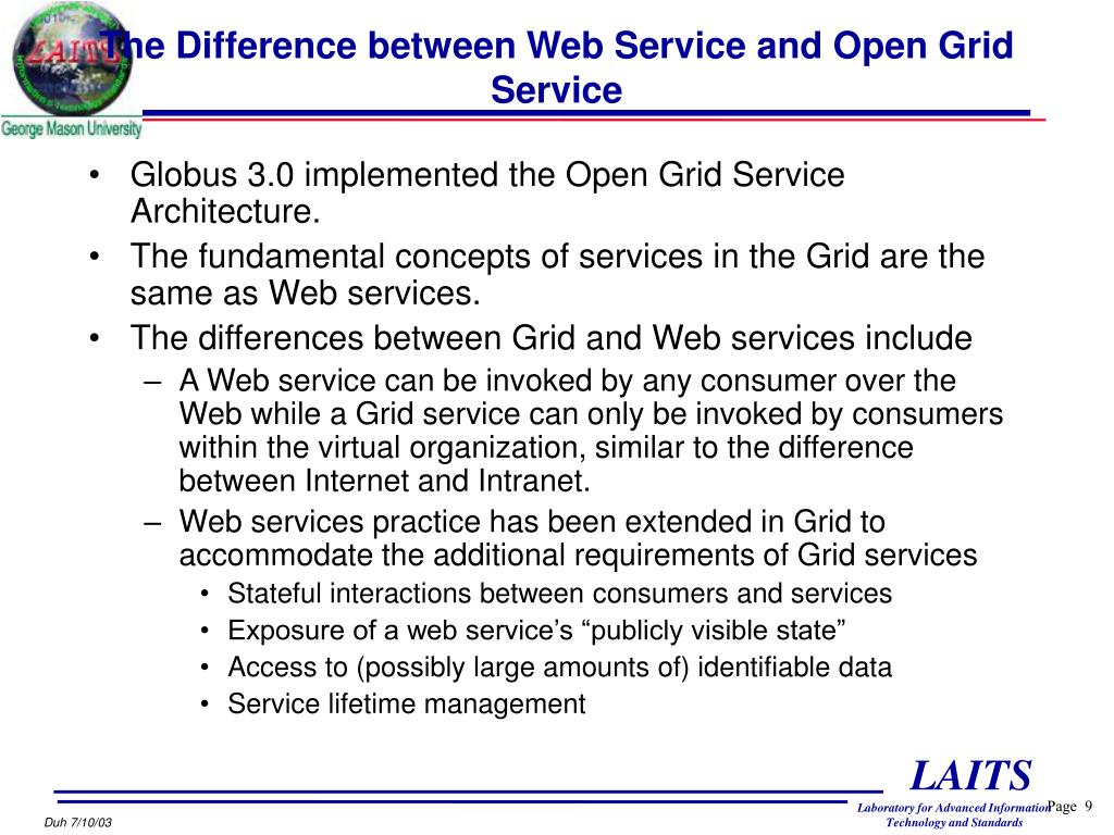 The Difference between Web Service and Open Grid Service • Globus 3.0 implemented the Open Grid Service Architecture. • The fundamental concepts of services in the Grid are the same as Web services. • The differences between Grid and Web services include • A Web service can be invoked by any consumer over the Web while a Grid service can only be invoked by consumers within the virtual organization, similar to the difference between Internet and Intranet. • Web services practice has been extended in Grid to accommodate the additional requirements of Grid services • Stateful interactions between consumers and services • Exposure of a web service’s “publicly visible state” • Access to (possibly large amounts of) identifiable data • Service lifetime management