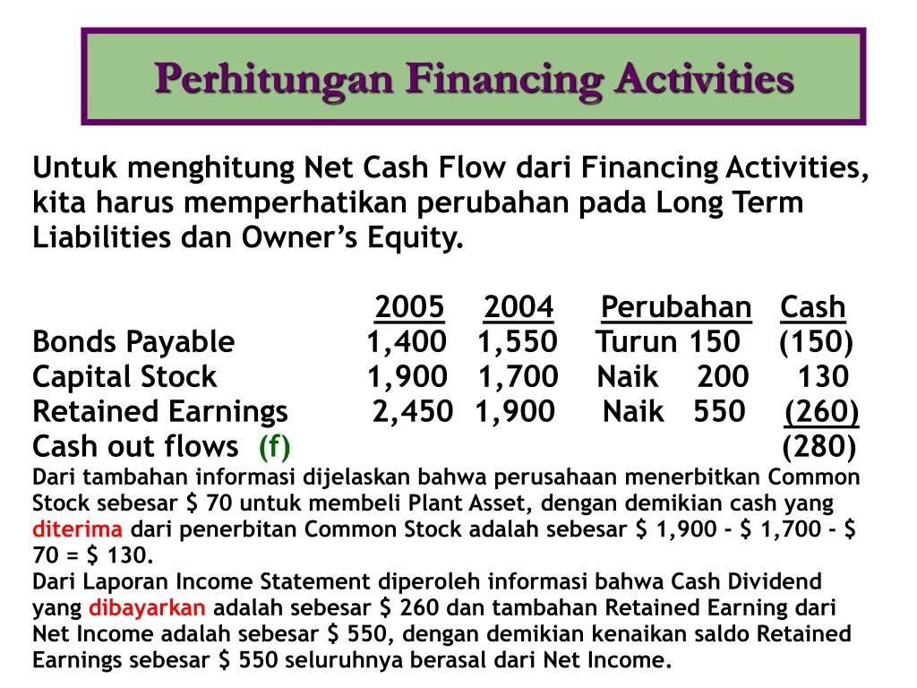 Perhitungan Financing Activities Untuk menghitung Net Cash Flow dari Financing Activities, kita harus memperhatikan perubahan pada Long Term Liabilities dan Owner’s Equity. 20052004PerubahanCash Bonds Payable 1,400 1,550 Turun 150 (150) Capital Stock 1,900 1,700 Naik 200 130 Retained Earnings 2,450 1,900 Naik 550 (260) Cash out flows (f) (280) Dari tambahan informasi dijelaskan bahwa perusahaan menerbitkan Common Stock sebesar $ 70 untuk membeli Plant Asset, dengan demikian cash yang diterima dari penerbitan Common Stock adalah sebesar $ 1,900 - $ 1,700 - $ 70 = $ 130. Dari Laporan Income Statement diperoleh informasi bahwa Cash Dividend yang dibayarkan adalah sebesar $ 260 dan tambahan Retained Earning dari Net Income adalah sebesar $ 550, dengan demikian kenaikan saldo Retained Earnings sebesar $ 550 seluruhnya berasal dari Net Income.