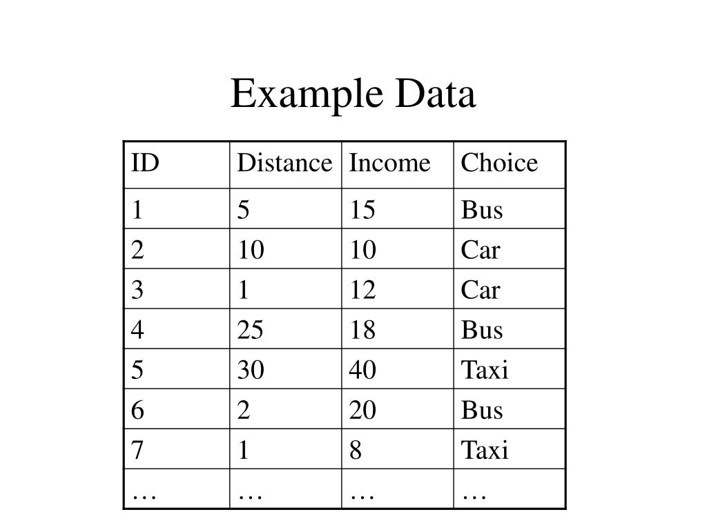Examples • Choice of transportation – bus, taxi, private car • Choice of product brand • Occupational choice (considered as unordered) – craft, blue collar, professional, white collar