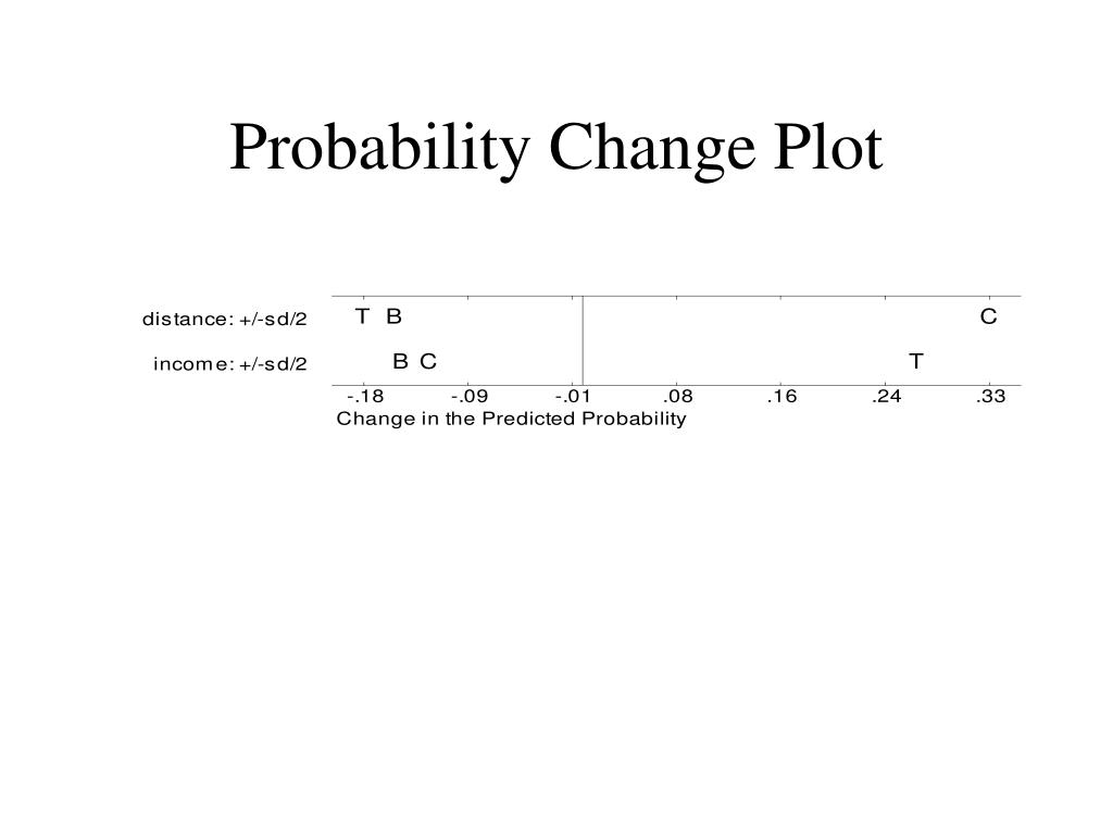 Sample Results ----------------------------------------------------- outcome | Coef. Std. Err. z P>|z| -------------+--------------------------------------- Taxi | distance | -.0757664 .1305456 -0.58 0.562 income | .319901 .0830162 3.85 0.000 _cons | -6.22562 1.734012 -3.59 0.000 -------------+--------------------------------------- Car | distance | .4482523 .1129979 3.97 0.000 income | .0447404 .0581754 0.77 0.442 _cons | -2.587764 1.214103 -2.13 0.033 ----------------------------------------------------- (Outcome outcome==Bus is the comparison group)