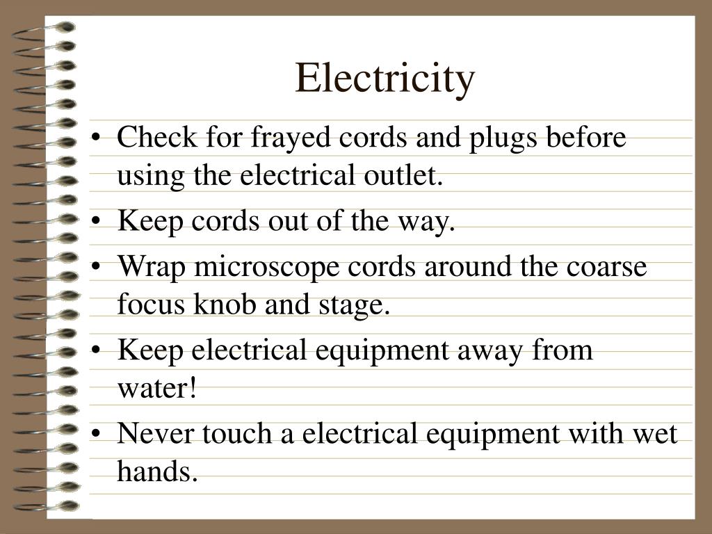 Electricity • Check for frayed cords and plugs before using the electrical outlet. • Keep cords out of the way. • Wrap microscope cords around the coarse focus knob and stage. • Keep electrical equipment away from water! • Never touch a electrical equipment with wet hands.