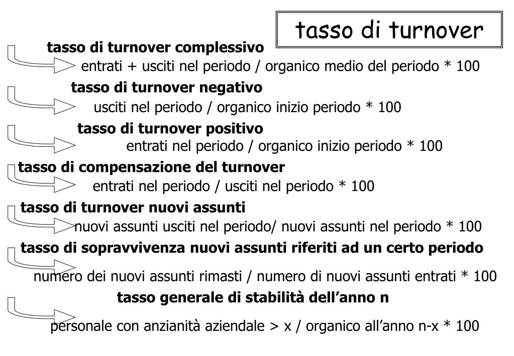 tasso di turnover complessivo entrati + usciti nel periodo / organico medio del periodo * 100 tasso di turnover negativo usciti nel periodo / organico inizio periodo * 100 tasso di turnover positivo tasso di compensazione del turnover entrati nel periodo / organico inizio periodo * 100 entrati nel periodo / usciti nel periodo * 100 tasso di turnover nuovi assunti nuovi assunti usciti nel periodo/ nuovi assunti nel periodo * 100 tasso di sopravvivenza nuovi assunti riferiti ad un certo periodo tasso generale di stabilità dell’anno n numero dei nuovi assunti rimasti / numero di nuovi assunti entrati * 100 personale con anzianità aziendale > x / organico all’anno n-x * 100 tasso di turnover