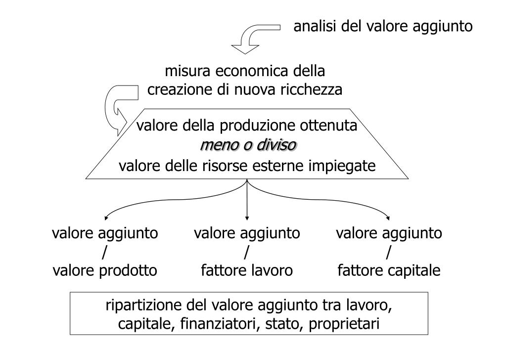 analisi del valore aggiunto misura economica della creazione di nuova ricchezza valore della produzione ottenuta meno o diviso valore delle risorse esterne impiegate valore aggiunto / valore prodotto valore aggiunto / fattore lavoro valore aggiunto / fattore capitale ripartizione del valore aggiunto tra lavoro, capitale, finanziatori, stato, proprietari