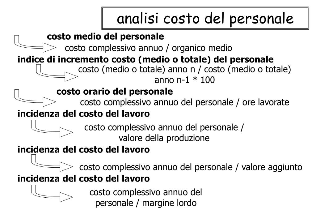 costo medio del personale costo complessivo annuo / organico medio indice di incremento costo (medio o totale) del personale costo (medio o totale) anno n / costo (medio o totale) anno n-1 * 100 costo orario del personale incidenza del costo del lavoro costo complessivo annuo del personale / ore lavorate costo complessivo annuo del personale / valore della produzione incidenza del costo del lavoro costo complessivo annuo del personale / valore aggiunto incidenza del costo del lavoro costo complessivo annuo del personale / margine lordo analisi costo del personale