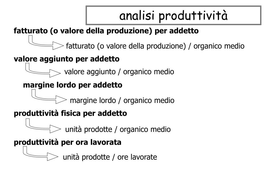fatturato (o valore della produzione) per addetto fatturato (o valore della produzione) / organico medio valore aggiunto per addetto valore aggiunto / organico medio margine lordo per addetto margine lordo / organico medio produttività fisica per addetto unità prodotte / organico medio produttività per ora lavorata unità prodotte / ore lavorate analisi produttività