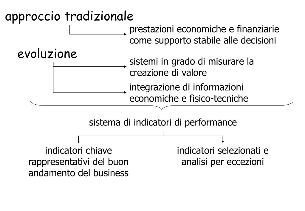 approccio tradizionale prestazioni economiche e finanziarie come supporto stabile alle decisioni evoluzione sistemi in grado di misurare la creazione di valore integrazione di informazioni economiche e fisico-tecniche sistema di indicatori di performance indicatori chiave rappresentativi del buon andamento del business indicatori selezionati e analisi per eccezioni
