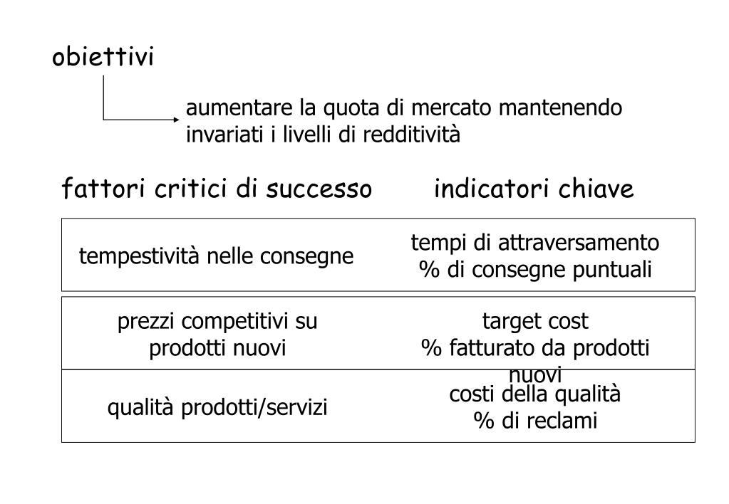 obiettivi aumentare la quota di mercato mantenendo invariati i livelli di redditività fattori critici di successo indicatori chiave tempi di attraversamento % di consegne puntuali tempestività nelle consegne prezzi competitivi su prodotti nuovi target cost % fatturato da prodotti nuovi costi della qualità % di reclami qualità prodotti/servizi