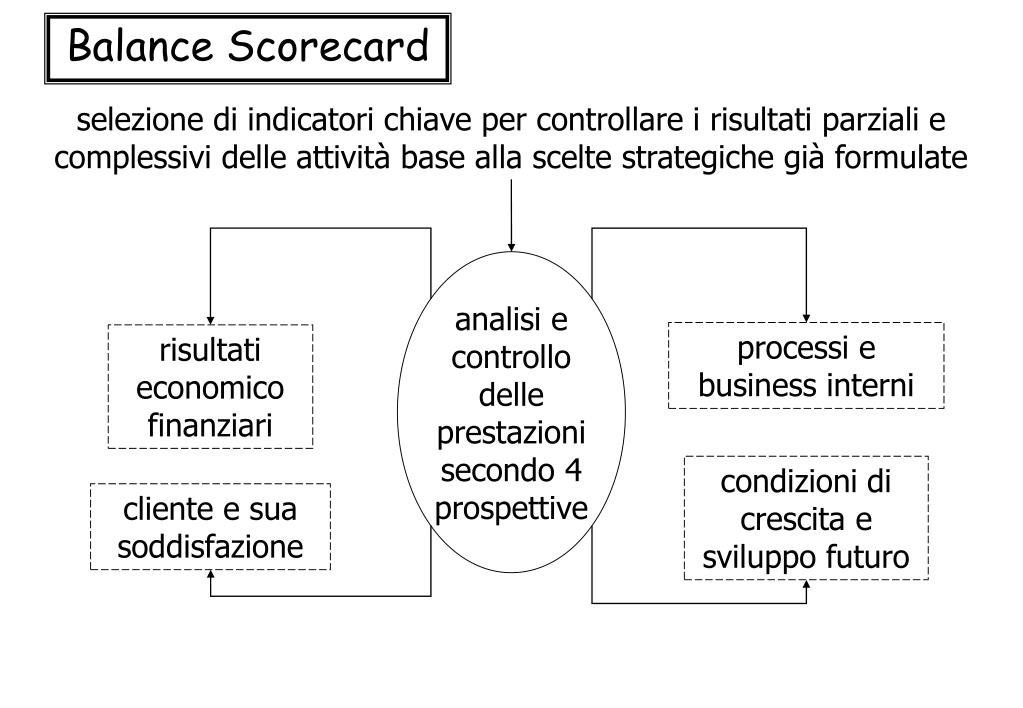 Balance Scorecard selezione di indicatori chiave per controllare i risultati parziali e complessivi delle attività base alla scelte strategiche già formulate analisi e controllo delle prestazioni secondo 4 prospettive processi e business interni risultati economico finanziari condizioni di crescita e sviluppo futuro cliente e sua soddisfazione