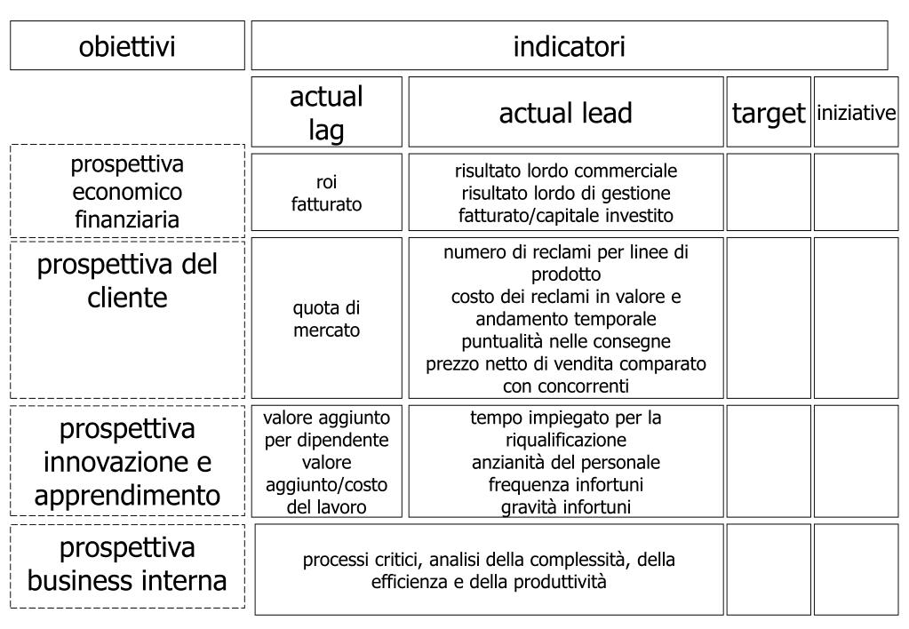 obiettivi indicatori actual lag actual lead target iniziative prospettiva economico finanziaria roi fatturato risultato lordo commerciale risultato lordo di gestione fatturato/capitale investito quota di mercato numero di reclami per linee di prodotto costo dei reclami in valore e andamento temporale puntualità nelle consegne prezzo netto di vendita comparato con concorrenti prospettiva del cliente valore aggiunto per dipendente valore aggiunto/costo del lavoro tempo impiegato per la riqualificazione anzianità del personale frequenza infortuni gravità infortuni prospettiva innovazione e apprendimento processi critici, analisi della complessità, della efficienza e della produttività prospettiva business interna