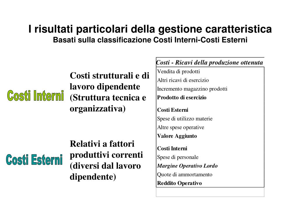 I risultati particolari della gestione caratteristicaBasati sulla classificazione Costi Interni-Costi Esterni Costi strutturali e di lavoro dipendente (Struttura tecnica e organizzativa) Costi Interni Relativi a fattori produttivi correnti (diversi dal lavoro dipendente) Costi Esterni