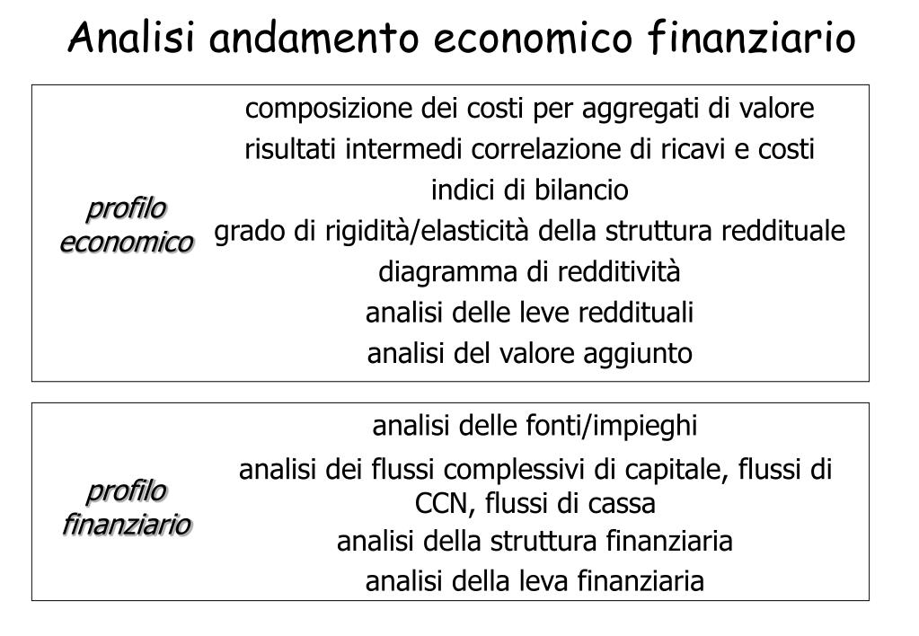 composizione dei costi per aggregati di valore risultati intermedi correlazione di ricavi e costi indici di bilancio grado di rigidità/elasticità della struttura reddituale diagramma di redditività analisi delle leve reddituali analisi del valore aggiunto Analisi andamento economico finanziario profilo economico analisi delle fonti/impieghi analisi dei flussi complessivi di capitale, flussi di CCN, flussi di cassa profilo finanziario analisi della struttura finanziaria analisi della leva finanziaria