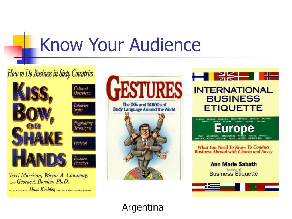 Know Your Audience • The O.K. sign and ” I Got your nose sign” as used in the US is considered obscene to the Guatemalans, O.K. means money to the Japanese • Latin American people are warm and friendly and make a lot of physical contact. They often touch shoulders or hold another’s arm, to withdraw from such a contact is considered insulting • Some western gestures convey nothing to the Japanese: shrugging of the shoulders or wink of an eye between friends