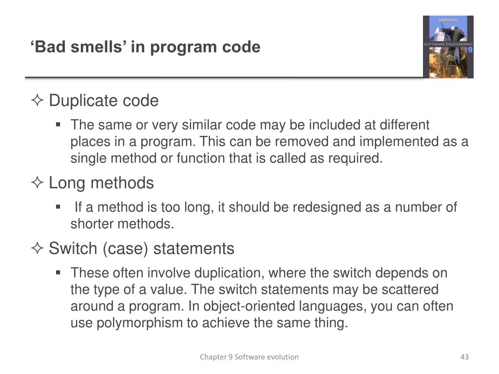 ‘Bad smells’ in program code • Duplicate code • The same or very similar code may be included at different places in a program. This can be removed and implemented as a single method or function that is called as required. • Long methods • If a method is too long, it should be redesigned as a number of shorter methods. • Switch (case) statements • These often involve duplication, where the switch depends on the type of a value. The switch statements may be scattered around a program. In object-oriented languages, you can often use polymorphism to achieve the same thing. Chapter 9 Software evolution