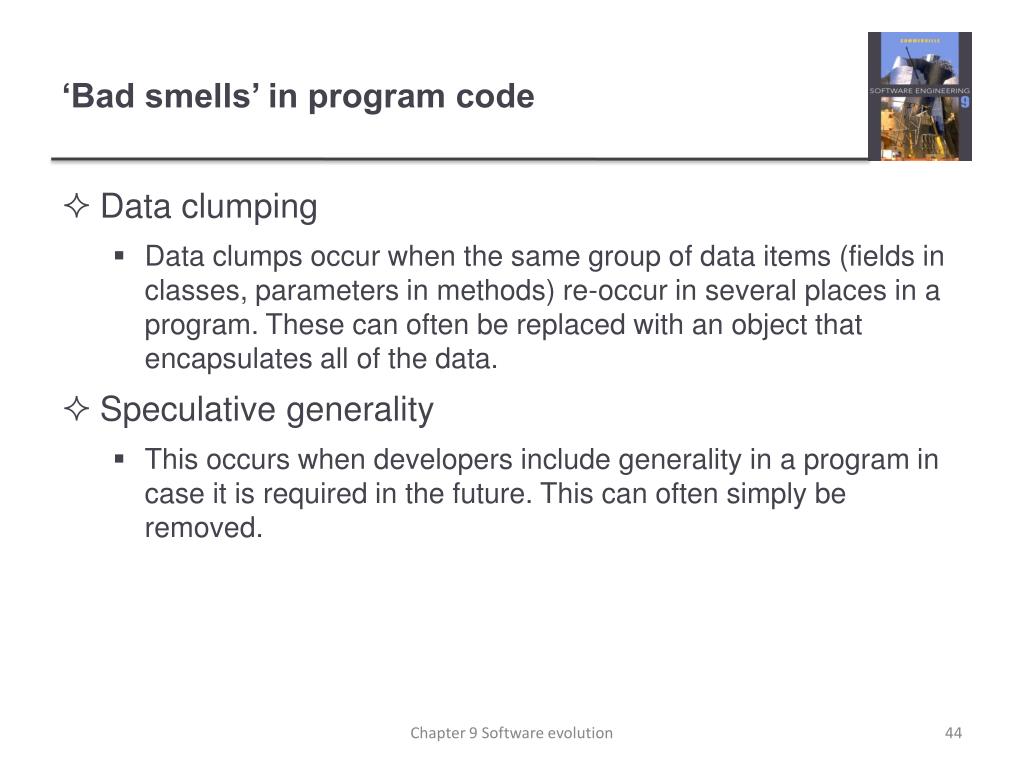 ‘Bad smells’ in program code • Data clumping • Data clumps occur when the same group of data items (fields in classes, parameters in methods) re-occur in several places in a program. These can often be replaced with an object that encapsulates all of the data. • Speculative generality • This occurs when developers include generality in a program in case it is required in the future. This can often simply be removed. Chapter 9 Software evolution
