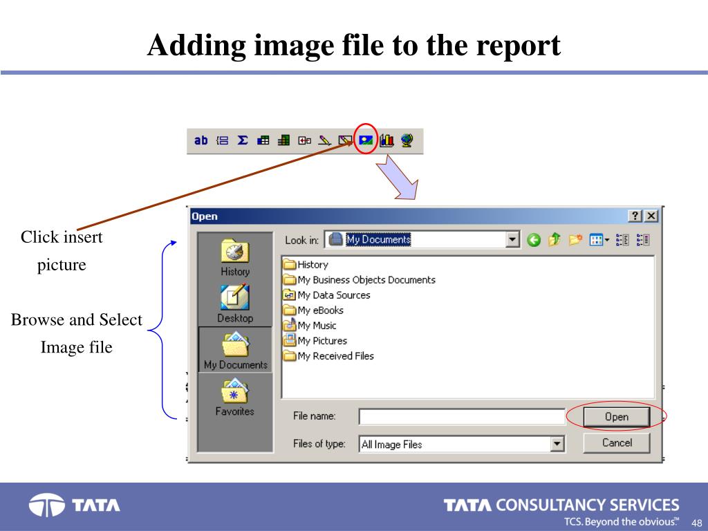 Adding image file to the report Click insert picture Browse and Select Image file