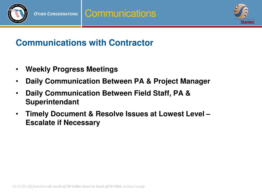 Communications Other Considerations Communications with Contractor • Weekly Progress Meetings • Daily Communication Between PA & Project Manager • Daily Communication Between Field Staff, PA & Superintendant • Timely Document & Resolve Issues at Lowest Level – Escalate if Necessary
