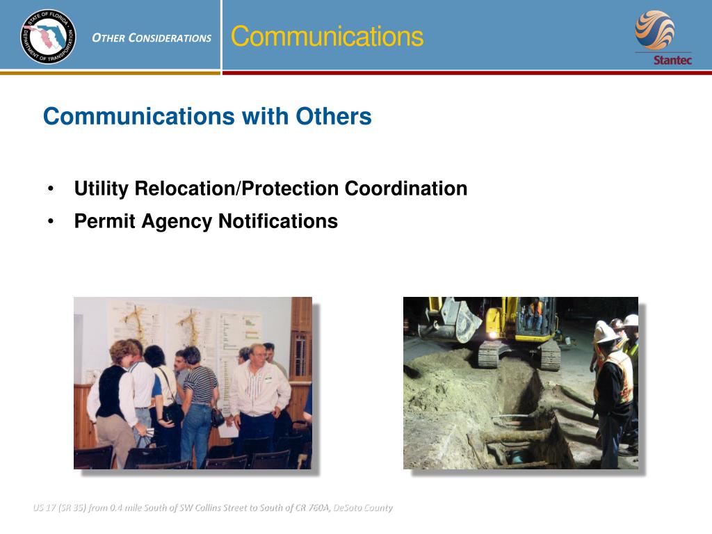 Communications Other Considerations Communications with Others • Utility Relocation/Protection Coordination • Permit Agency Notifications