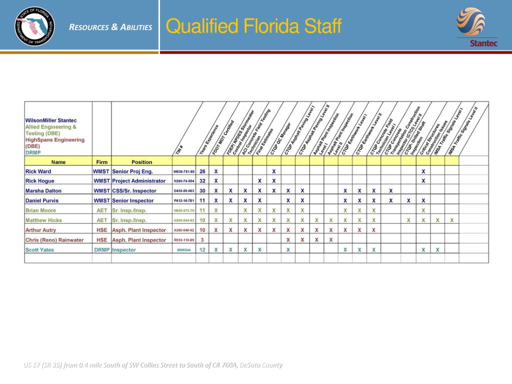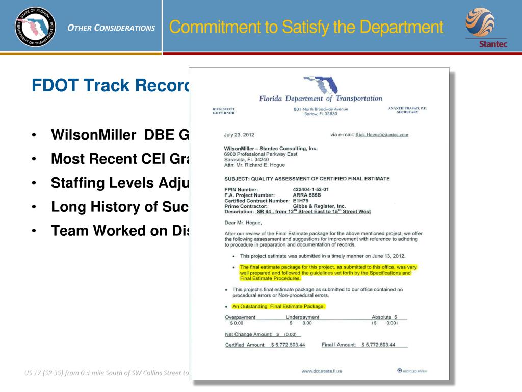 Commitment to Satisfy the Department Other Considerations FDOT Track Record • WilsonMiller DBE Grade – A (12.93 % $ to DBEs) • Most Recent CEI Grade – 3.4 (C8V38) • Staffing Levels Adjusted to Project Needs • Long History of Successful CEI Project Closeout • Team Worked on District 1 Projects for Past 10 Years