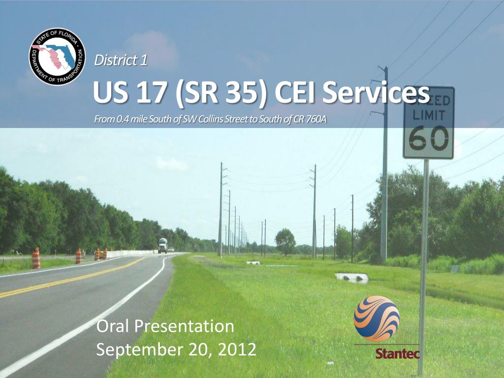 District 1 US 17 (SR 35) CEI Services From 0.4 mile South of SW Collins Street to South of CR 760A Oral Presentation September 20, 2012