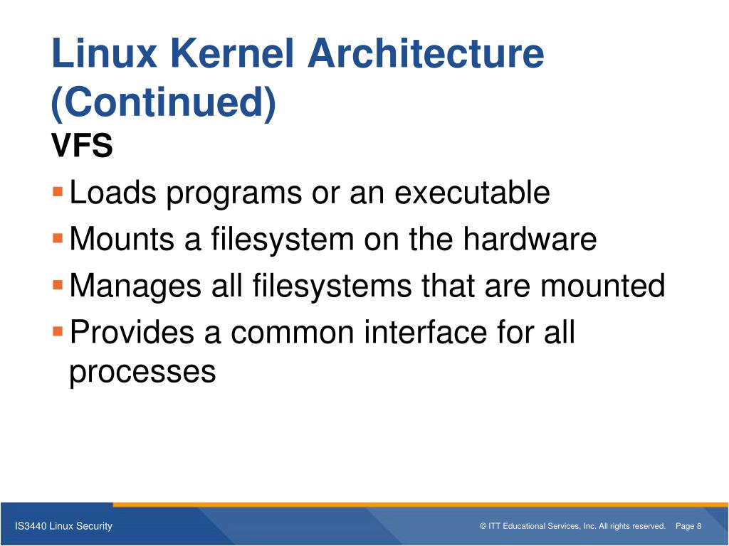 Linux Kernel Architecture (Continued) VFS • Loads programs or an executable • Mounts a filesystem on the hardware • Manages all filesystems that are mounted • Provides a common interface for all processes