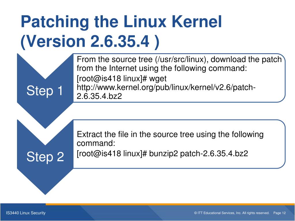 Patching the Linux Kernel (Version 2.6.35.4 ) Step 1 • From the source tree (/usr/src/linux), download the patch from the Internet using the following command: • [root@is418 linux]# wget http://www.kernel.org/pub/linux/kernel/v2.6/patch-2.6.35.4.bz2 Step 2 • Extract the file in the source tree using the following command: • [root@is418 linux]# bunzip2 patch-2.6.35.4.bz2