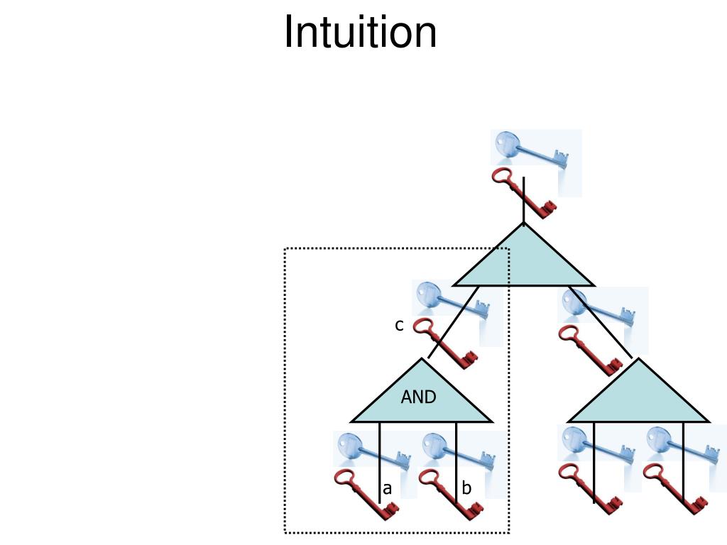 AND OR AND OR AND NOT Alice’s inputs Bob’s inputs Overview: • Alice prepares “garbled” version C’ of C • Sends “encrypted” form x’ of her input x • Allows bob to obtain “encrypted” form y’ of his input y • Bob can compute from C’,x’,y’ the “encryption” z’ of z=C(x,y) • Bob sends z’ to Alice and she decrypts and reveals to him z Crucial properties: • Bob never sees Alice’s input x in unencrypted form. • Bob can obtain encryption of y without Alice learning y. • Neither party learns intermediate values. • Remains secure even if parties try to cheat.