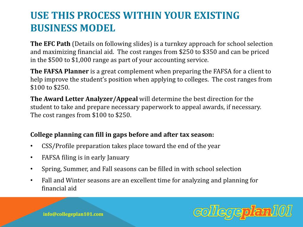 Use this Process Within Your Existing Business Model • The EFC Path (Details on following slides) is a turnkey approach for school selection and maximizing financial aid. The cost ranges from $250 to $350 and can be priced in the $500 to $1,000 range as part of your accounting service. • The FAFSA Planner is a great complement when preparing the FAFSA for a client to help improve the student’s position when applying to colleges. The cost ranges from $100 to $250. • The Award Letter Analyzer/Appeal will determine the best direction for the student to take and prepare necessary paperwork to appeal awards, if necessary. The cost ranges from $100 to $250. • College planning can fill in gaps before and after tax season: • CSS/Profile preparation takes place toward the end of the year • FAFSA filing is in early January • Spring, Summer, and Fall seasons can be filled in with school selection • Fall and Winter seasons are an excellent time for analyzing and planning for financial aid