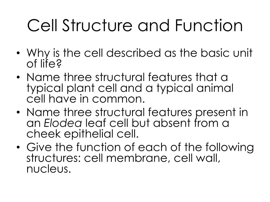 Cell Structure and Function • Why is the cell described as the basic unit of life? • Name three structural features that a typical plant cell and a typical animal cell have in common. • Name three structural features present in an Elodea leaf cell but absent from a cheek epithelial cell. • Give the function of each of the following structures: cell membrane, cell wall, nucleus.