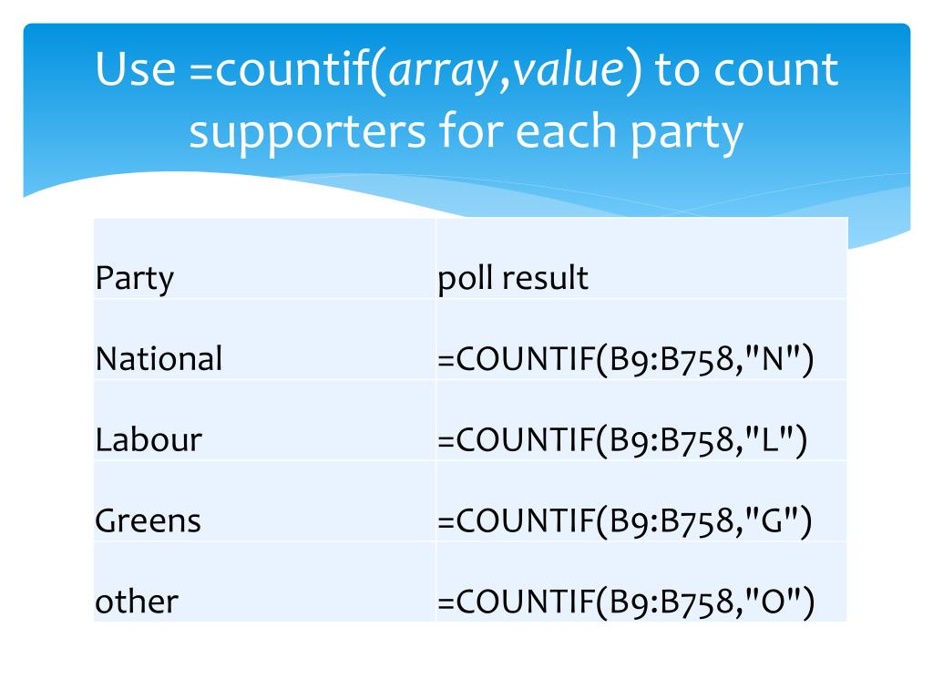 Use =countif(array,value) to count supporters for each party
