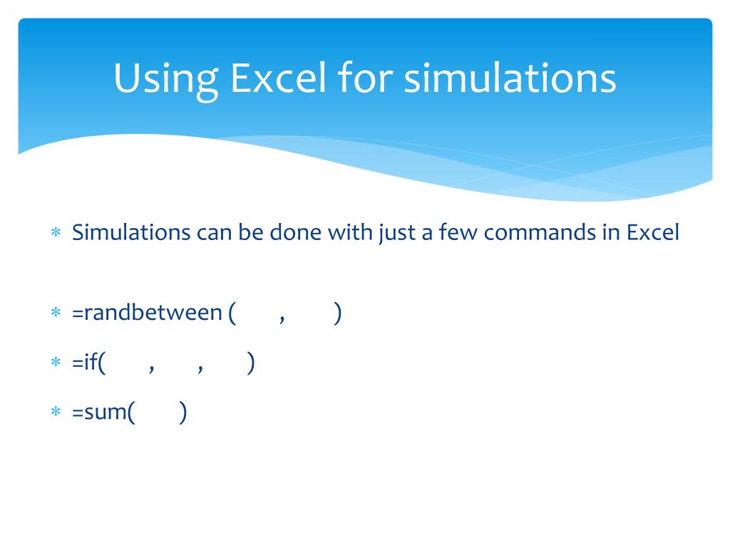 Using Excel for simulations Simulations can be done with just a few commands in Excel =randbetween ( , ) =if( , , ) =sum( )