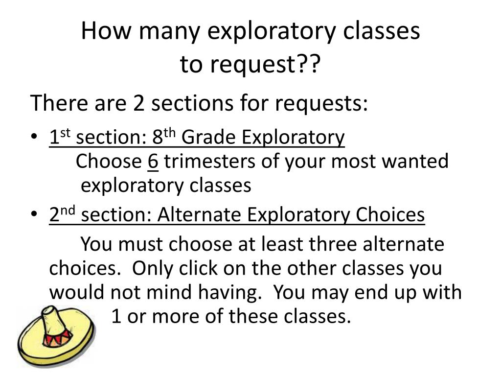 How many exploratory classes to request?? There are 2 sections for requests: • 1st section: 8th Grade Exploratory Choose 6 trimesters of your most wanted exploratory classes • 2nd section: Alternate Exploratory Choices You must choose at least three alternate choices. Only click on the other classes you would not mind having. You may end up with 1 1 or more of these classes.