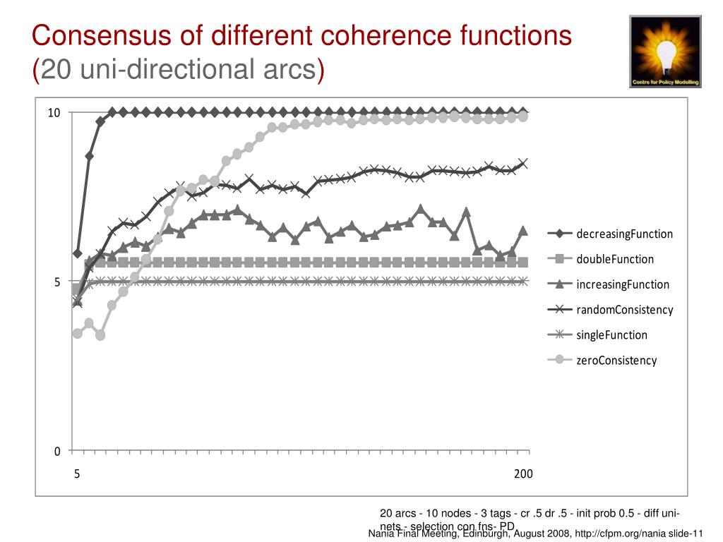 Consensus of different coherence functions (20 uni-directional arcs) 20 arcs - 10 nodes - 3 tags - cr .5 dr .5 - init prob 0.5 - diff uni-nets - selection con fns- PD Nania Final Meeting, Edinburgh, August 2008, http://cfpm.org/nania slide-11