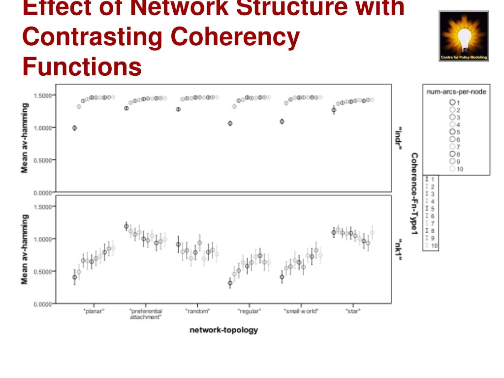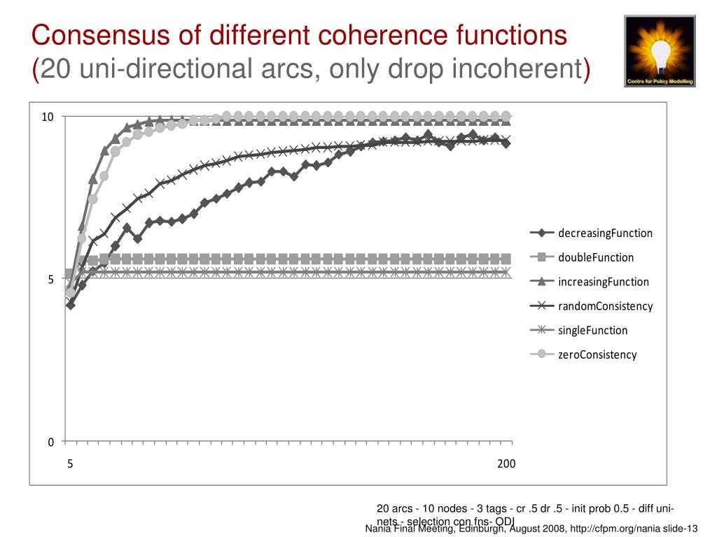 Consensus of different coherence functions (10 bi-directional arcs) 10 arcs - 10 nodes - 3 tags - cr .5 dr .5 - init prob 0.5 - diff Bi-nets - selection con fns- PD Nania Final Meeting, Edinburgh, August 2008, http://cfpm.org/nania slide-12