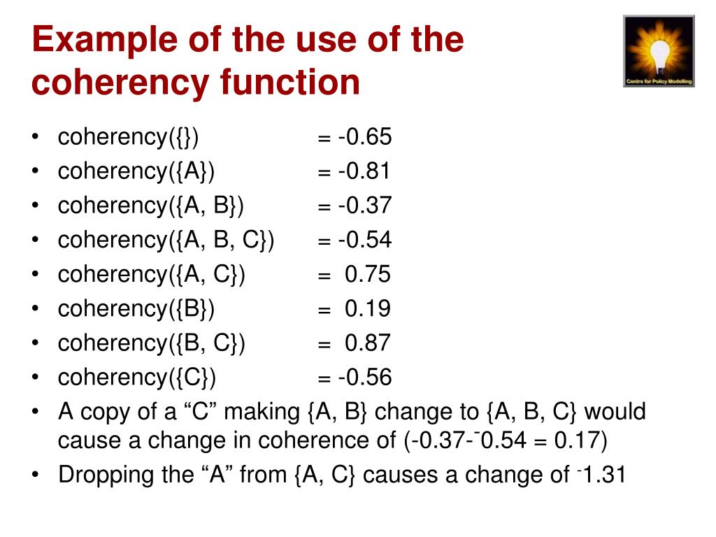 Example of the use of the coherency function coherency({}) = -0.65 coherency({A}) = -0.81 coherency({A, B}) = -0.37 coherency({A, B, C}) = -0.54 coherency({A, C}) = 0.75 coherency({B}) = 0.19 coherency({B, C}) = 0.87 coherency({C}) = -0.56 A copy of a “C” making {A, B} change to {A, B, C} would cause a change in coherence of (-0.37--0.54 = 0.17) Dropping the “A” from {A, C} causes a change of -1.31