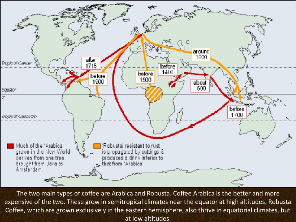 The two main types of coffee are Arabica and Robusta. Coffee Arabica is the better and more expensive of the two. These grow in semitropical climates near the equator at high altitudes. Robusta Coffee, which are grown exclusively in the eastern hemisphere, also thrive in equatorial climates, but at low altitudes.