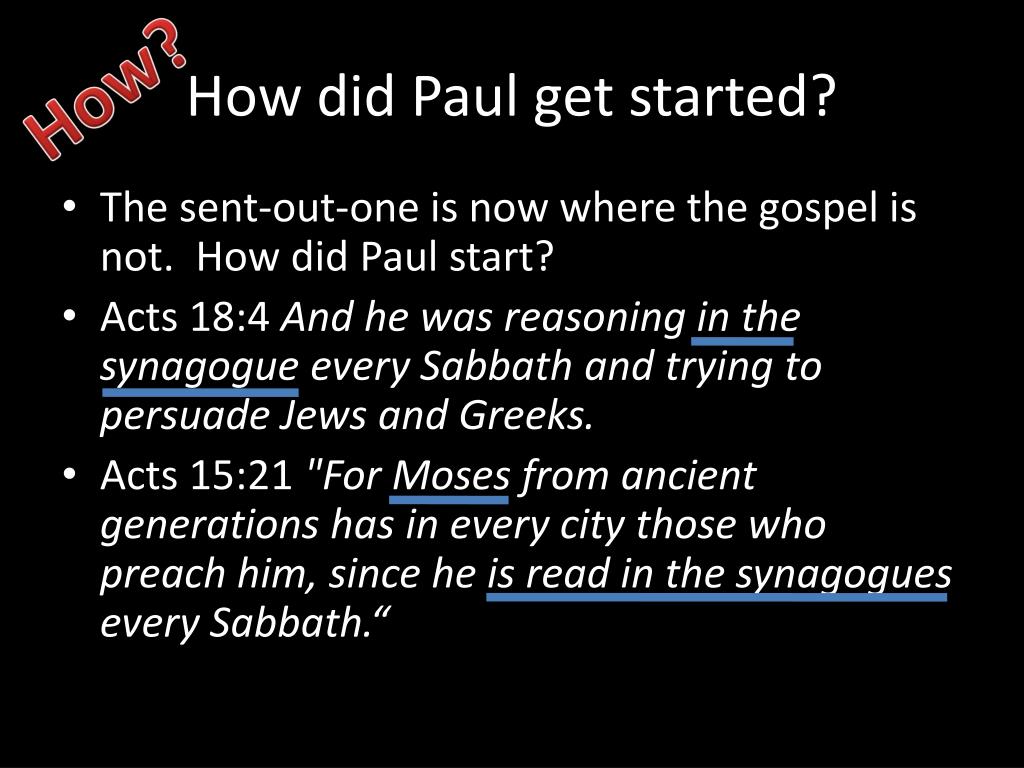 How did Paul get started? How? • The sent-out-one is now where the gospel is not. How did Paul start? • Acts 18:4 And he was reasoning in the synagogue every Sabbath and trying to persuade Jews and Greeks. • Acts 15:21 "For Moses from ancient generations has in every city those who preach him, since he is read in the synagogues every Sabbath.“