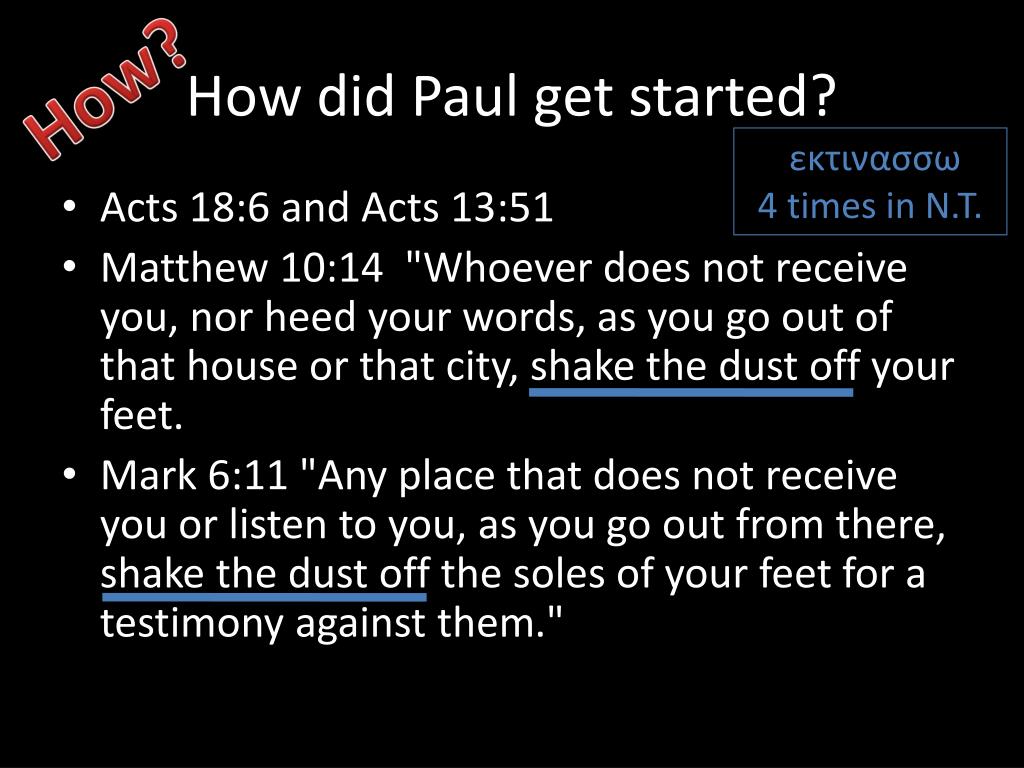 How did Paul get started? How? εκτινασσω 4 times in N.T. • Acts 18:6 and Acts 13:51 • Matthew 10:14 "Whoever does not receive you, nor heed your words, as you go out of that house or that city, shake the dust off your feet. • Mark 6:11 "Any place that does not receive you or listen to you, as you go out from there, shake the dust off the soles of your feet for a testimony against them."