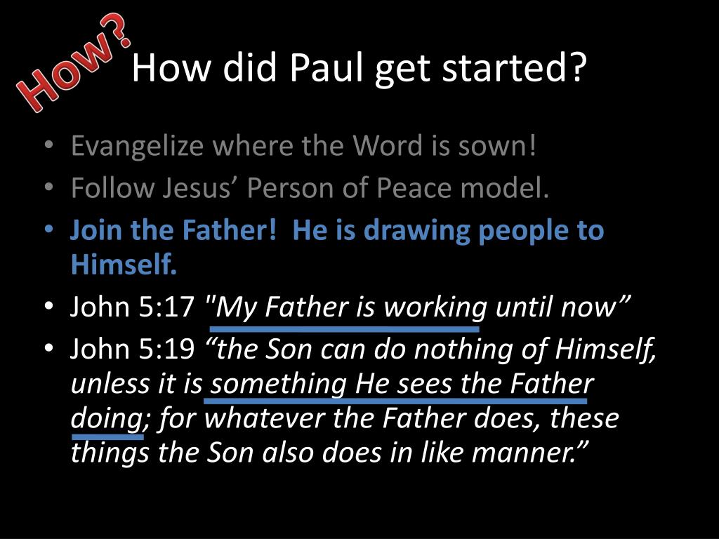 How did Paul get started? How? • Evangelize where the Word is sown! • Follow Jesus’ Person of Peace model. • Join the Father! He is drawing people to Himself. • John 5:17 "My Father is working until now” • John 5:19 “the Son can do nothing of Himself, unless it is something He sees the Father doing; for whatever the Father does, these things the Son also does in like manner.”