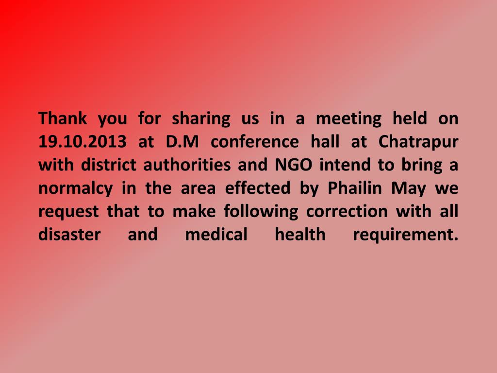 Thank you for sharing us in a meeting held on 19.10.2013 at D.M conference hall at Chatrapur with district authorities and NGO intend to bring a normalcy in the area effected by Phailin May we request that to make following correction with all disaster and medical health requirement.