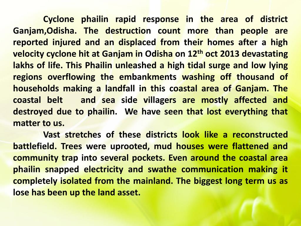 Cyclone phailin rapid response in the area of district Ganjam,Odisha. The destruction count more than people are reported injured and an displaced from their homes after a high velocity cyclone hit at Ganjamin Odisha on 12thoct 2013 devastating lakhsof life. This Phailinunleashed a high tidal surge and low lying regions overflowing the embankments washing off thousand of households making a landfall in this coastal area of Ganjam. The coastal belt and sea side villagers are mostly affected and destroyed due to phailin. We have seen that lost everything that matter to us. Vast stretches of these districts look like a reconstructed battlefield. Trees were uprooted, mud houses were flattened and community trap into several pockets. Even around the coastal area phailinsnapped electricity and swathe communication making it completely isolated from the mainland. The biggest long term us as lose has been up the land asset.