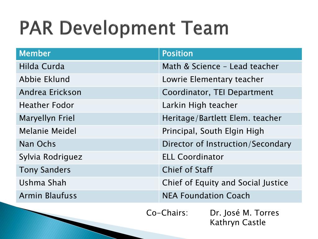 Background • Grant from NEA Foundation Institute for Innovation in Teaching & Learning • Collaboration since fall 2010 • The PAR Team: • Attended NEA conferences • Researched model PAR programs • Developed PAR Program for U-46 (Stage 1)