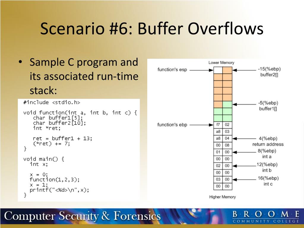 Scenario #6: Buffer Overflows • The idea behind a buffer overflow is to write more information into a reserved memory buffer than it can hold, causing other memory locations to be overwritten. • These memory locations exist on the run-time stack. By overwriting the locations with the proper information (malicious instructions and data), control of the program can be passed to the malicious code.
