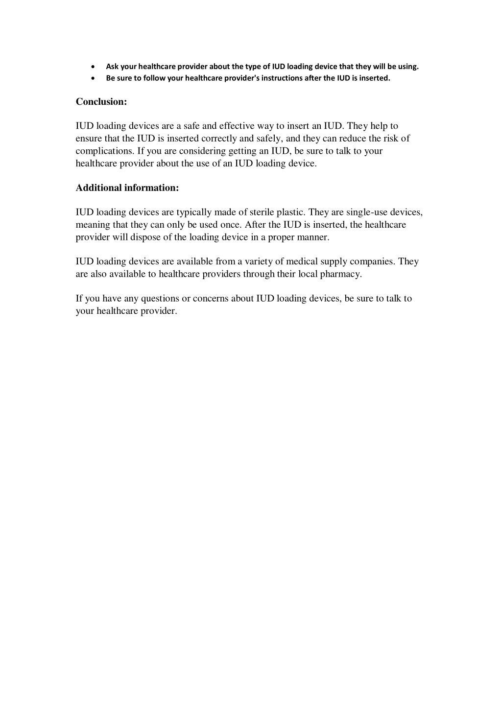 Ask your healthcare provider about the type of IUD loading device that they will be using. Be sure to follow your healthcare provider's instructions after the IUD is inserted. Conclusion: IUD loading devices are a safe and effective way to insert an IUD. They help to ensure that the IUD is inserted correctly and safely, and they can reduce the risk of complications. If you are considering getting an IUD, be sure to talk to your healthcare provider about the use of an IUD loading device. Additional information: IUD loading devices are typically made of sterile plastic. They are single-use devices, meaning that they can only be used once. After the IUD is inserted, the healthcare provider will dispose of the loading device in a proper manner. IUD loading devices are available from a variety of medical supply companies. They are also available to healthcare providers through their local pharmacy. If you have any questions or concerns about IUD loading devices, be sure to talk to your healthcare provider.